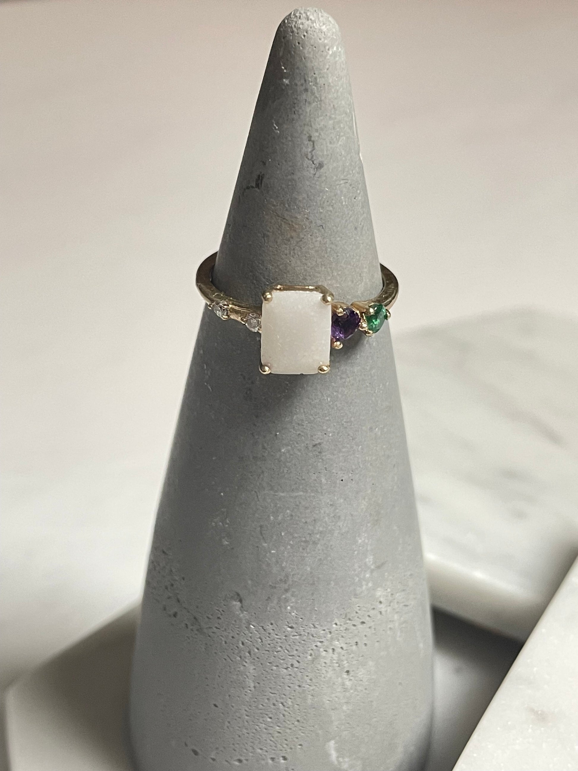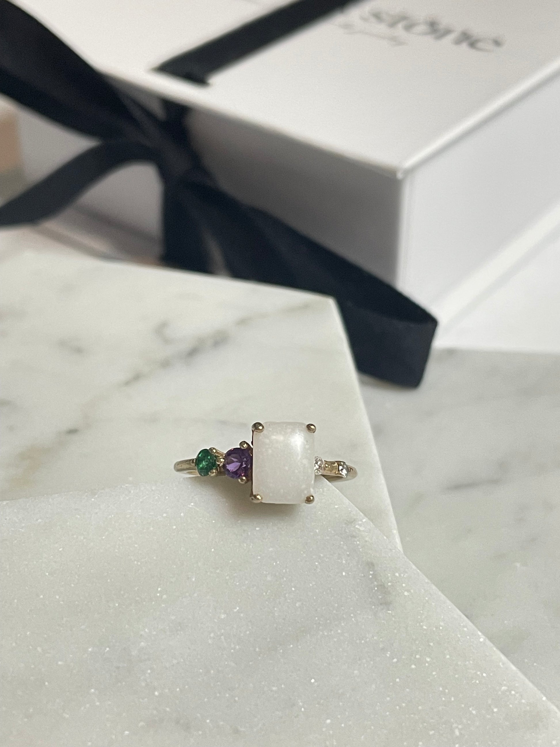 The Savannah Ring provides an exquisite look with its 14k gold and emerald cut milk stone. You can also choose two birthstones on one side, and two genuine diamonds on the other side for an extra luxurious touch. Adorn yourself with this gorgeous piece and showcase your unique breastfeeding journey with a lasting keepsake.